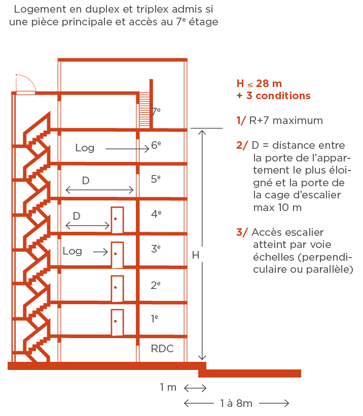 | Plancher bas du niveau le plus haut situé au plus à 8m du sol | Différence de hauteur entre les niveaux extrêmes de l’établissement inférieure ou égale à 8m |